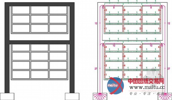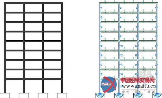 通俗建筑的示意图,绿色为重力荷载在程度楼面的传递,蓝色为重力荷载沿着柱墙向下勾当的线路。好比,每层每跨的重力荷载是2,楼面梁两个端头传递给柱子的重力荷载为1。边柱最上面受力为1,往下每层递增1;中柱最上面受力为2,往下每层递增2。总的重力荷载为54,最终经由过程柱子汇进大年夜地。当然,因为各种启事,良多布局并没有选择这类最通俗的解决方案。在日本,良多高层采取了巨型框架系统。这类系统可以理解成一个五斗橱,然后在每个抽屉格子里塞进一个小建筑。