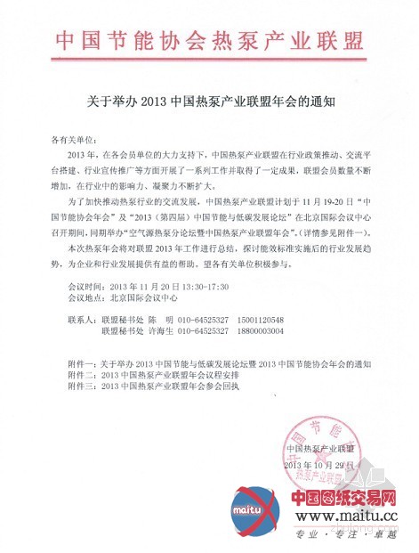 详情请见附件!看各有关单位积极报名插手。请参照附件三要求将参会回执于最晚2013年11月12日前发电子邮件至中国热泵财产联盟秘书处。