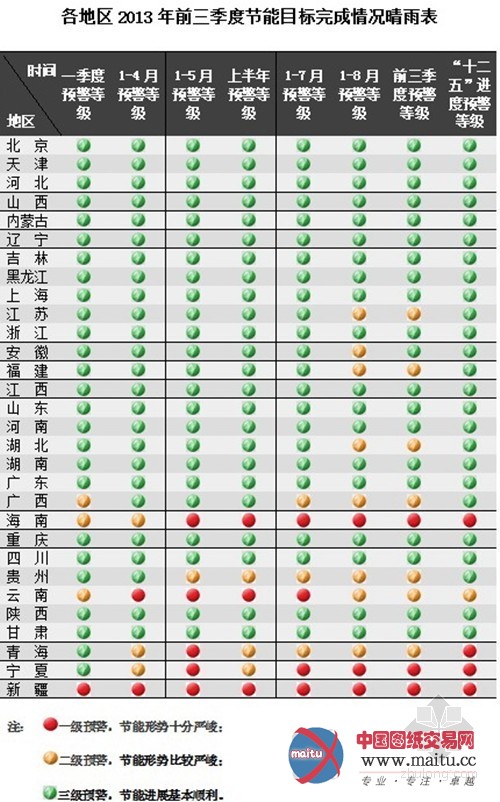 与“十二五”节能工作进度要求比拟较,海南、青海、宁夏、新疆等4个地区预警等第为一级,云南预警等第为二级,北京、天津、河北、山西、内蒙古、辽宁、吉林、黑龙江、上海、江苏、浙江、安徽、福建、江西、山东、河南、湖北、湖南、广东、广西、重庆、四川、贵州、陕西、甘肃等25个地区预警等第为三级。