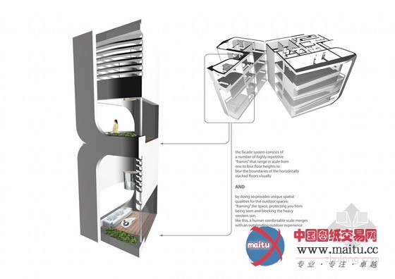 该大年夜楼为居平易近供给了合适的高度,其上设有莳植园,和豪华的糊口举措措施,使该糊口区变得十分便利。该室第的周围有高级购物区。它的方针是建成一个与天然相连、有人文特点的居平易近楼。高大年夜的空间、敞亮的公寓,像花圃一般的通道,垂直的地形构成的有机光圈都十分给这座居平易近楼加分。塔外不雅分四层部门,大年夜型的玻璃窗户凸起来,阳台都凹进往。起伏的图案不竭应用了不间断的审美布局元素,还可以或许遮阳。这个统一的外形系统使得室内的外形也十分统一。为了表现“活景不雅”的布局,每间套房的都被多功能举措措施占用。为了进步室内的亮度,每个屋里都安装了落地窗。如许的设计更能让居平易近赏识到小区***的绿地,更体味小区的绿化布局。