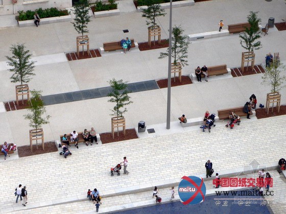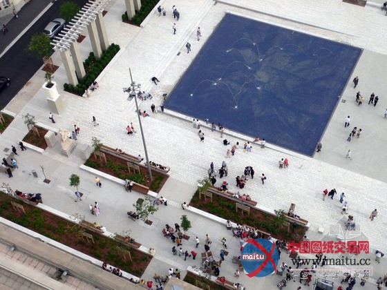 广场地面展装有两道平行线,显示了广场和周围街道之间的关系。设计师为现有的大年夜门覆上葡萄藤蔓,以期该广场可以或许更好地融进这座城市,成为其一部门。