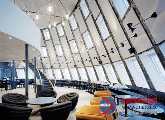 在内部,关头的元素和墙壁用桦木胶合板和桦树皮笼盖。地面展有吸音地毯。传统的威卢克斯屋顶窗已被用来作为外表的元素,以交叉网格或图案的外形放置在北立面上。这类设计不但供给了一个杰出的视野,还使餐厅变得敞亮,空气清爽。北欧的特别光照经由过程威卢克斯屋顶窗透进来,就像树枝间的阳光。