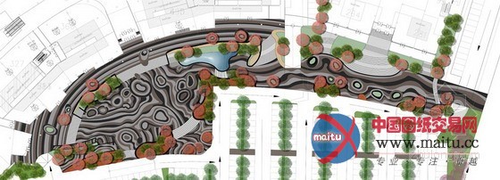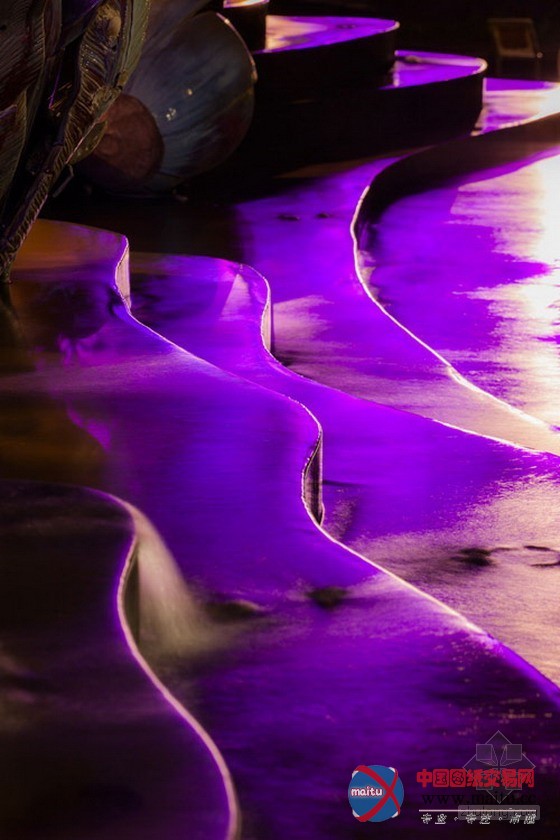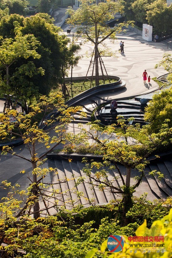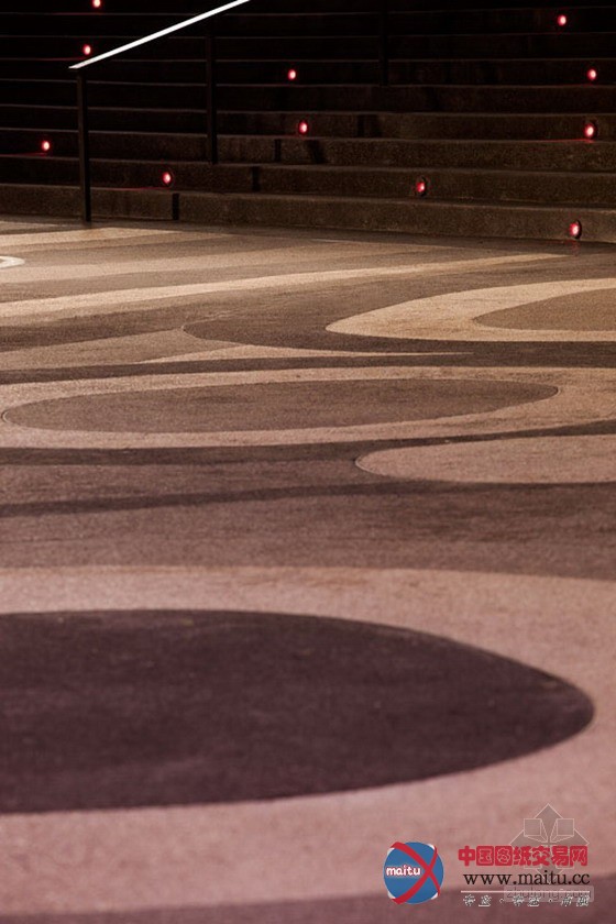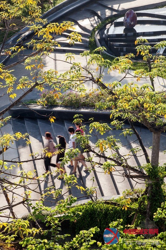广场景不雅的设计灵感来自于北部天然梯田式的山地景不雅,这类景不雅情势反应在场地上便构成了光鲜的展装图案和起伏的花丘,台阶、座椅、跌水等景不雅都是像等高线轮廓一样的流线体,矫捷地契合了原始地形。流线形的水磨石路面和座椅等也都操纵了本地的天然石材。