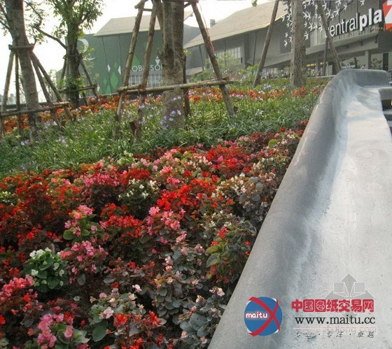 乡土树种的选择揭示了区域生态环境。选择本地的原生植物红木棉树(俗称Ngiew)为基调树种,凸显出北部的天然气息。每年的一月到三月,伴跟着红木棉树开出的黄色花朵,覆满外墙的黄色凌霄花和广场上的花灌木都让广场显得刺目和敞亮。