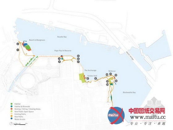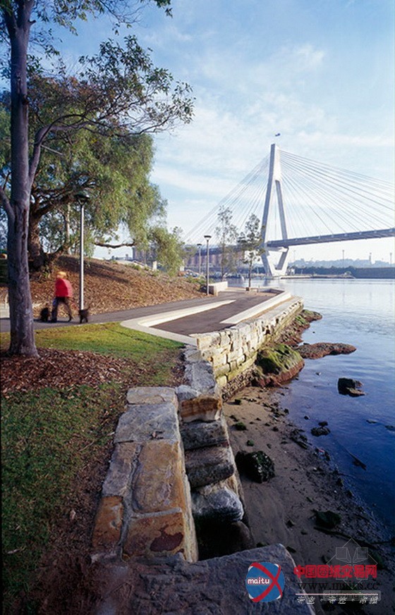 JMD公司设计的滨海大年夜道总长2.5千米。大年夜道沿着悉尼海港,从皮尔蒙特大年夜桥连绵至罗泽尔湾。这个项目包含了红树林生境重建、滨海平台和坡道景不雅、滨水步道景不雅、沙岸景不雅,还有一个有着丰硕汗青布景的浮桥,它不可是海事财产遗址,也是财产考古的对象。此次设计解决了本地环境标题问题同时立场光鲜地表达了现有遗址的价值。