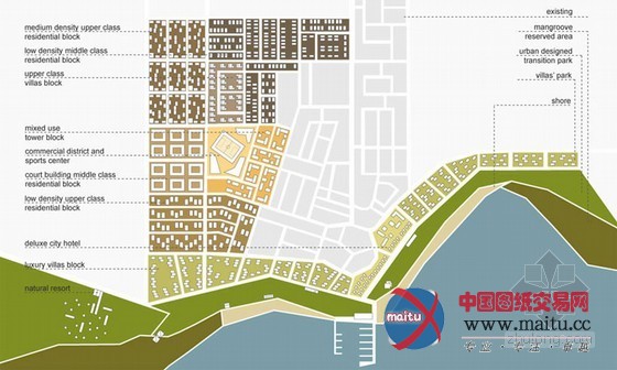 从海岸向内,占地275000平方米的商业室第项目密度不竭增加。沿海区域的主特点为一座城市花圃,用于组织公共勾当和进行音乐会。这个奇特的景不雅带将连接城市南北,表现了对天然栖息地、对红树林呵护区和本地生态的尊敬。不合的住房类型将室第设计与周围环境、既有建筑融为一体。公共绿地空间的设计意在创作发现一种社区感,进行多种多样的文娱休闲勾当。意味城市有效核心的商业区,被安设在翻新的活动场周围。项目同化了传统建筑元素和全新科技方案,侧重节能和可延续成长。