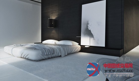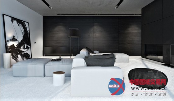 波兰罗兹公寓装修设计,简约,质感,现代的空间。仿佛只有气场强大年夜的自流平地面才可以加倍应景,柔嫩的毛绒地毯增加一丝人道的热和。
