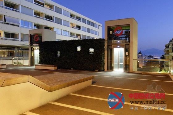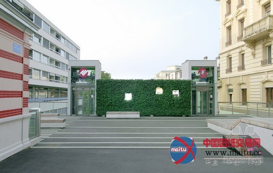 场地位于建筑相对的两个侧面:南面朝向莱蒙湖,北面朝向街道。该项目经由过程创作发现8米长、3米高、0.5米宽的立体绿化墙,提出“建筑化景不雅”的概念。绿墙上的小窗口将莱蒙湖和阿尔卑斯山的美景框进此中。小尺度的视窗强化了“城市居室”的概念,并令人们体验由室内空间赏识外部空间景不雅的奇奥感触感染。