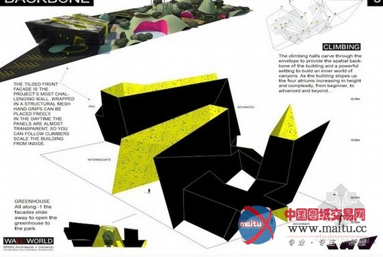 该项目还将技能性倾斜以最小化热负荷,避开对临近公园和会场的投影。在建筑的最高点,还设有一个屋顶酒吧,坐拥全部保加利亚旅游胜地之一的毕特夏山的美景。除攀岩和巨石区域,该项目还包含多功能活动室、泳池、水疗中间、办公空间、酒吧和餐厅。得益于位于城市主轴的地舆优势,这里将成为首要的城市地标和城市文脉与周围景不雅的缓冲区。