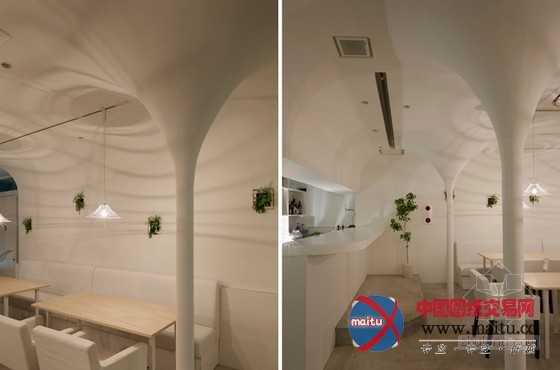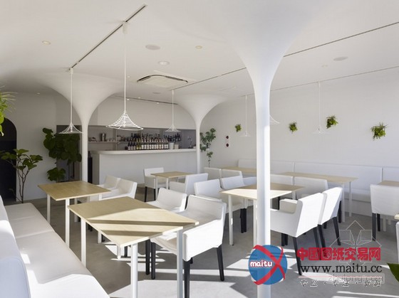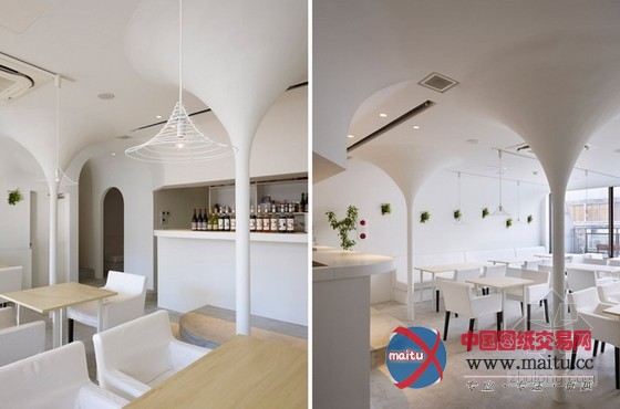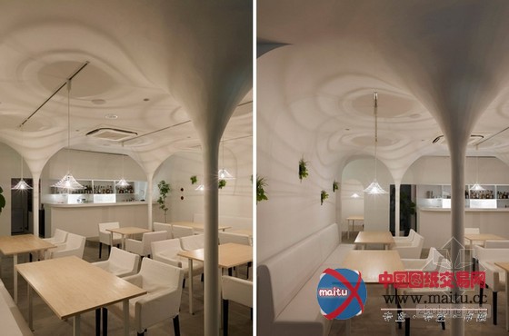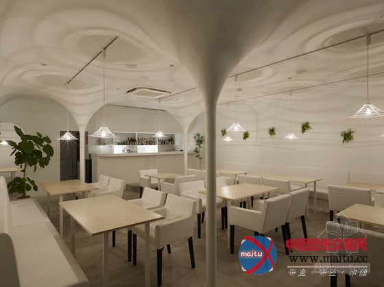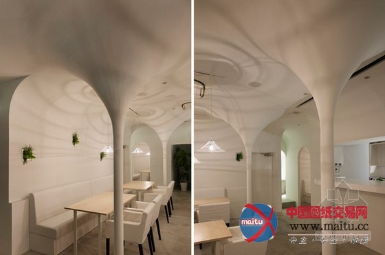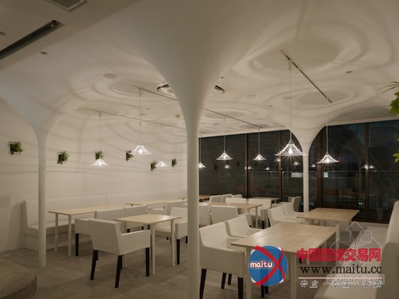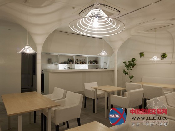 白色调餐厅装修设计,空间中的柱子与天花交代处被做成倒立柔和的圆锥形体,构成近似穹顶一样的结果。寥寥几根金属丝围出的灯罩也标新立异的采取这类形体,相反的,灯罩从客人的角度看是正立的圆锥形体。空间中客人首要经由过程的通道其上方也做成圆弧状。灯光颠末圆锥形体金属丝灯罩,投射到空间中,仿佛涟漪之光,那纹路与天花的倒圆锥结果构成相得彰益,让人不由赞叹的浪漫结果。冷艳而有情调。