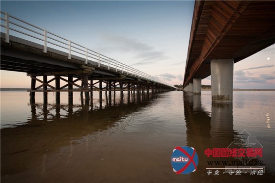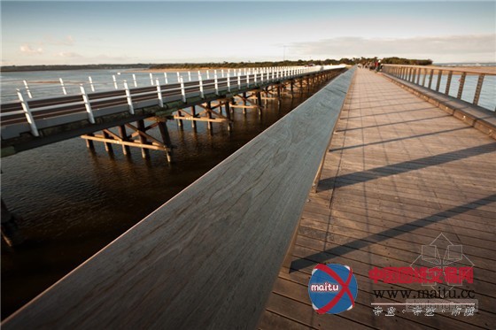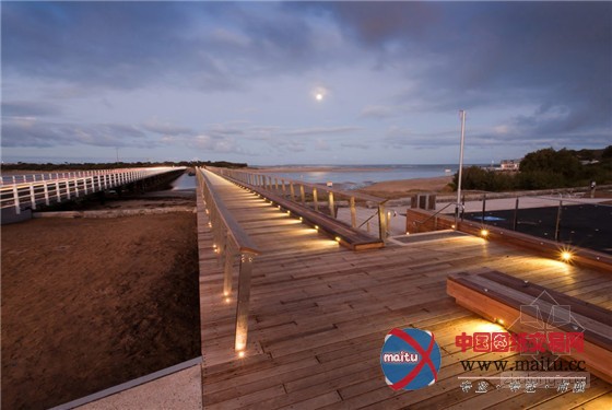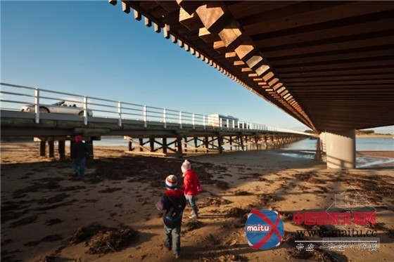 在迷人的海滨景不雅中,这座桥表示了木材的完美质感。桥的首要布局是包裹着木材的混凝土。桥的下面是一个复杂的变形几何体,良多木条彼此倾斜、联锁,构成了暗影交叉的有趣的视觉结果。