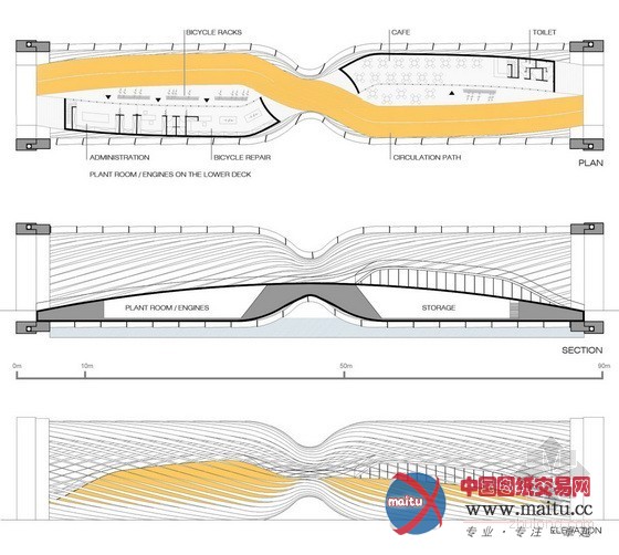 在此次设计方案中,涡***桥不但用来增强大年夜桥两端的联系,还可觉得人们供给多功能的勾当空间。为了达到这一目标,整座大年夜桥像一艘大年夜船一样地漂浮在阿姆斯特尔河上。桥身内部有公共勾当空间、人行和自行车行驶线路和咖啡馆、办公室等等。大年夜桥的顶面上还设计了配有活动场的歇息平台,植物房、涡轮发念头室和储存室则设计在船面的下面。假定从上空俯瞰的话,整座大年夜桥的模样像一只漏斗,最中间的位置是不合交通流线的一个交汇点。
