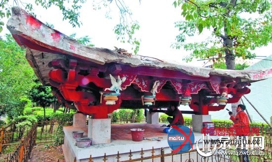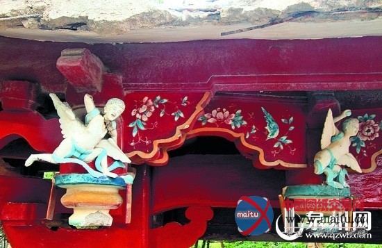 穿过门楼来到府文庙广场,在蔡清祠东侧的绿化带上,记者看到了泮宫门楼旧屋顶,旧屋顶被置于一米多高的底座上,四周围有两道铁栅栏呵护着。当然旧屋顶上的红色木梁和彩画图案已掉落漆,展翅的“小天使”构件也颇具沧桑感,但恰是这古朴的质感和韵味,将其与周围的红砖古厝融为一体,成为府文庙广场的一个新景点。