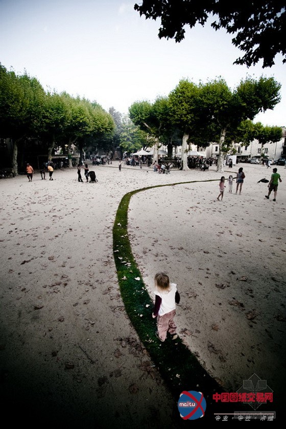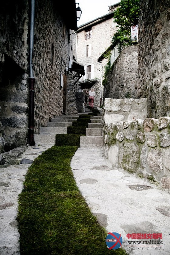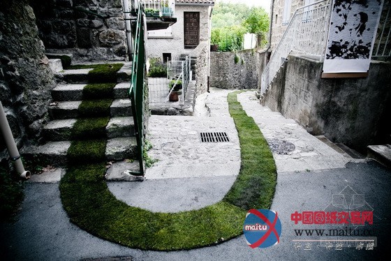 这个布满天然气息的“绿地毯”是为了庆贺Jaujac艺术节进行10周年而展设的,仿佛像一个天然景不雅艺术家留下的一步一步的印迹一样,让人回味无限。这场庆典一向延续到9月10日。“绿地毯”作为献给艺术节的礼品,连缀不竭地展设在小镇的各个街道,青绿的“地毯”代替了脚下的柏油路,指引着游人,使小镇与天然更近了一步。“绿地毯”从小镇的中间延长到各个住户门前,暗示着人,天然,艺术,这三者之间***的关系。