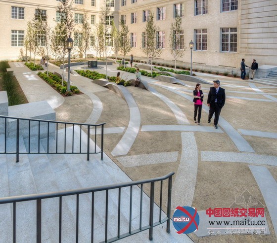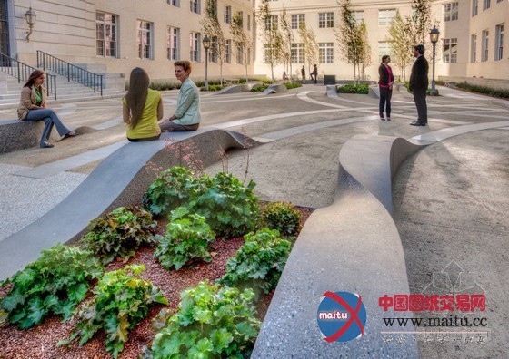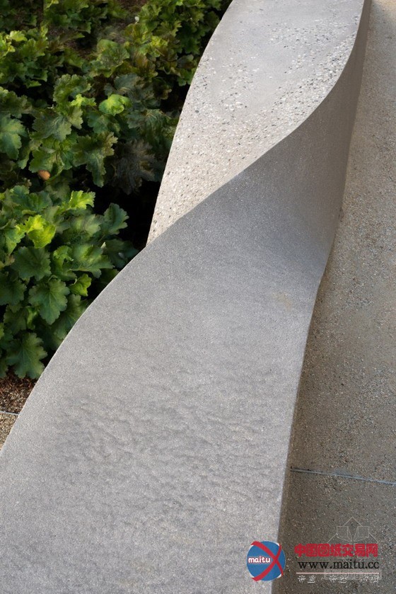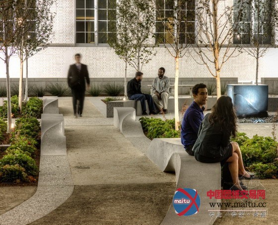 设计师Garten将原本的两个经典的喷泉的材质改成现代景不雅作品常常利用的花岗岩材质,并用混凝土展设了道路,构成一个较大年夜的透水概况部门。优雅的现浇混凝土长椅也设计成与线路符合的流线型,带给天井里的人们一种间断轮回的节拍感。