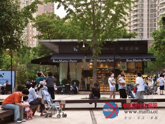 距离大年夜厦一楼商铺不远处是步行街的中间广场,上面大年夜量的长凳和稠密的树荫为住户供给了一个社区交换场合。矫捷的开放空间、歇息长廊为户外活动供给充沛的空间,家长们可以坐在长凳上看着他们的孩子滑旱冰,而白叟们则可以在小的花圃区内打太极。