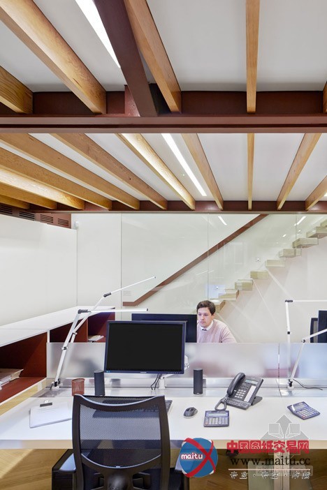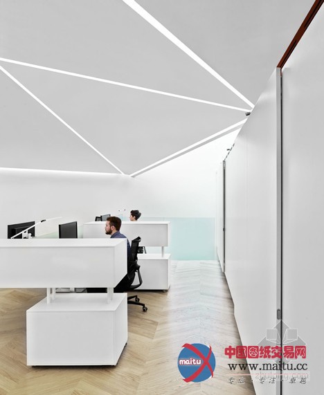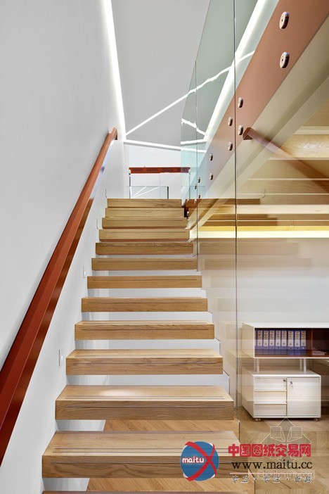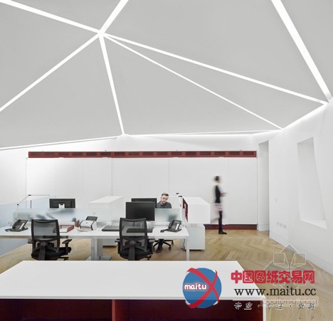 业主希看可以或许打破阳台的限制空间,让大年夜家可以或许更等闲的交换,与此同时在两个部门之间保留必然的分界。我们的方案是使阳台变得更宽阔,并且在狭小的空间内引进一个全新的建筑物为新旧空间创作发现一个戏剧性的过渡。根据对现有建筑的审计,处所当局觉得需保留一些元素。最值得存眷的是现存的银穹顶——砖拱布局且包含了一扇沉重的铁门。当然这不是一个抱负的位置,因而它就被用作低层空间的进口,成了一个非传统空间上的会议室。新的布局构建在两层楼之上的,可从地基层和地上层经由过程它通向露台。工作空间被设计为便可使各部门具有自力的区域,也可使团队之间充分的连通交换。各部门被放置在可以具有充分天然光线和外部阳台的区域里,它们之间没有什物将其豆割。一个不合弊端称的屋顶阁楼位于新屋顶的下面,埋没式照明凸起了几何式的空间。建筑后部一个两倍高的空地被豆割隔,一个悬臂式的木质楼梯贯通各楼层。利用屋顶照明和连接天井的玻璃是为了确保整栋建筑可以或许有充沛的光线。橡木镶花地板应用于全部新办公室的设计中,地下的木制托梁被涂上石灰曝露于外部。