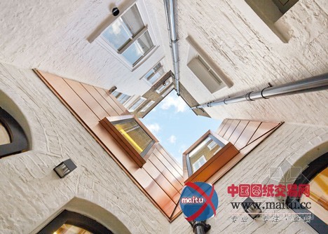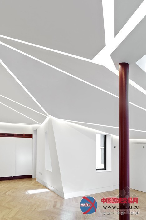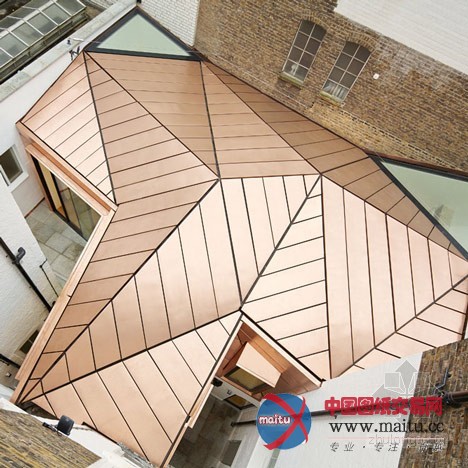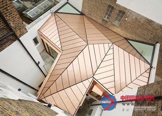 面对基地的限制,我们采取建筑周围现有高度的关头数据,经由过程其来创作发现一个与众不合的三角情势的屋顶。为了最高限度的操纵空间潜力,引进一些特定的屋顶外形元素使得天花至屋顶的高度被拉伸。现代气焰的折叠式屋顶情势,用了铜合金材料,对铜色的选择旨在与现有房屋的环境彼此***。临近光源的墙面是装有玻璃的,为了获得更好的透光性,在设计中又增加加了窗户和屋顶照明。