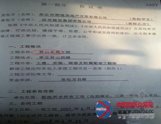 与地盘利用权合同响应的是另外一个版本的扶植工程施工合同。这份由光辉房产供给的《工程施工合同》,显示的工程名称恰是“君山明苑”,与项目照片符合。