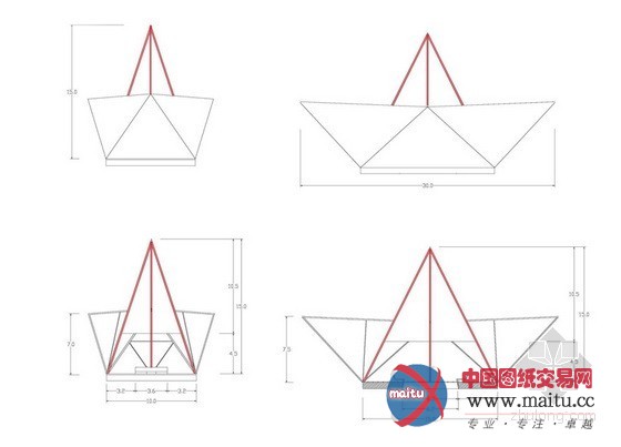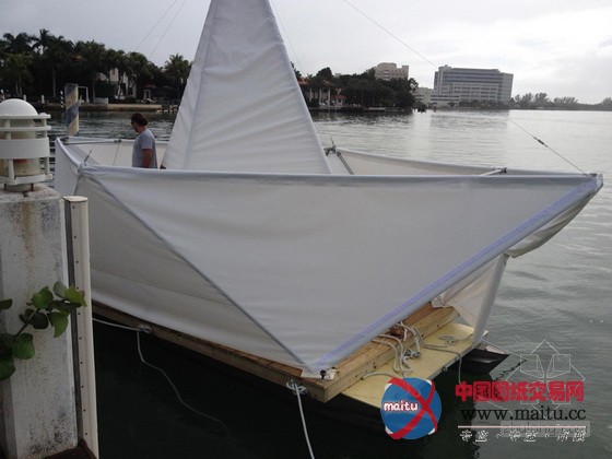 设计师luis pons说:“我一向沉迷于孩子想象的奇异世界”,是以“胡想浮纸”由儿童建造的不起眼的折叠纸船所开导,它采取了一个30英尺长,15英尺宽和高的坚毅的竹框布局,并由电线和一个白色的布帆装潢,它们被固定在一个驳船上。夜晚,它被绿色的灯光照亮,仿佛在徐徐前行。
