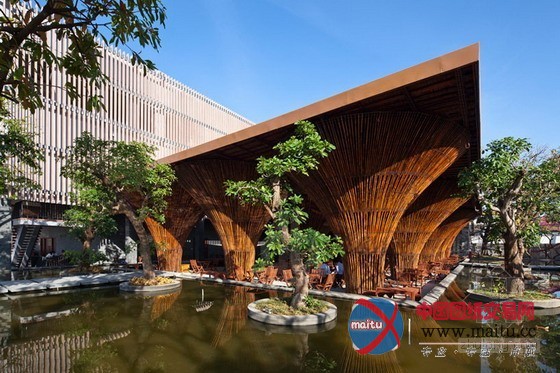 咖啡馆的主体建筑具有奇特的空间布局。用餐者的餐桌位于“竹伞”下面,周围通透,可以看到周围的人工湖,这进一步加强了人与天然之间的联系。为了应对该地区的常见的强热带风暴,咖啡厅还有15个圆锥形的撑持。此次设计的灵感来自越南传统的打鱼用的竹筐,屋顶采取茅草和加强纤维材料编制而成,光线可以很等闲地透过,洒进餐厅内,构成班驳的光影结果。并且餐厅内没有设置空调,经由过程周围水池和树荫的降温感化,即便是最热的季候在这里也会感触感染风凉舒适。