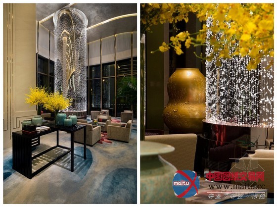 上海静安喷鼻格里拉大年夜酒店一列背光式水晶柱一向延长至大年夜堂的木质天花板,熠熠生辉,好像一条钻石手炼。HBA设计师用五层楼高的富丽水晶雕塑引出1,740平方米的无柱式大年夜宴会厅,范围属浦西之最。而此等设计足足应用了400万颗水晶。