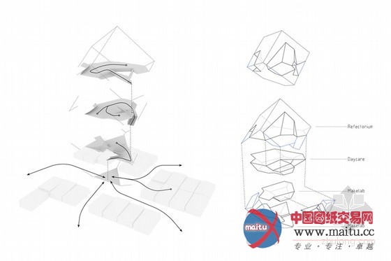 建筑师保留了现有的一些建筑,将新的功能区(公共餐区,日托中间等)放置在一个绕轴翘立的夺目立方体。这个立方体首要材料是预制混凝土板,从厚到薄,直到空的处所,由黄铜涂层的钢架过渡,这些钢架成为建筑的概况肌理,延其上,限制窗户,折进室内影响内部空间,并成为建筑概况的装潢。