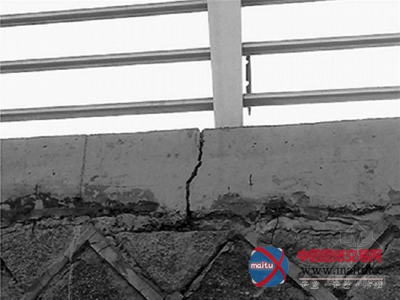 桥的北端下坡处,有一处十分较着的裂痕。本来平整的柏油路面上,一道0.5厘米宽的裂痕,横过了大年半夜个路面,足有七八米长。在桥北端的下方,桥身墙面上,裂开了一道10多厘米的裂痕,裂痕最宽有2厘米。