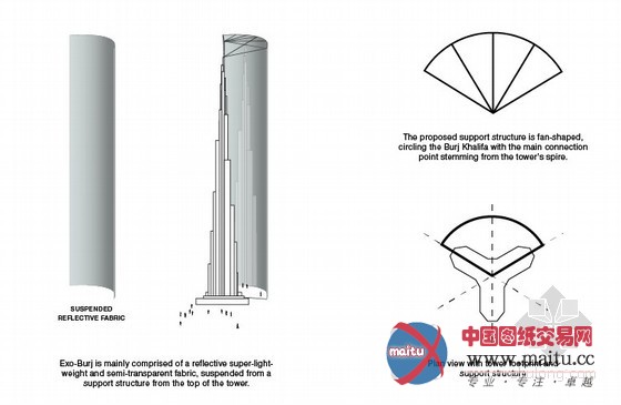这座戈壁上的建筑将会被一个超轻量、反光并且半透明织物材料包裹住。旅客不但可以从远处看这个姑且的包裹装配,它能反应高塔及其周边环境,并且可以或许近距离和装装配密切接触。提案的目标是供给一种流利的城市空气,加强城市天际线的视觉角度,增加“哈利法塔”作为一个疏忽重力的意味和凸起其建筑范围的巨大年夜。