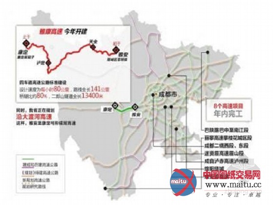 2014年四川将扶植多条高速公路,确保新建成通车500千米,新开工500千米,全省高速公路通车里程冲破5500千米。此中成都第二绕城东段、西段,遂资眉眉山段等高速,本年都将建成通车,雅安至康定、汶川至马尔康等高速也将开工扶植。此中,雅康高速的扶植,将完全改变甘孜境内无高速的汗青。