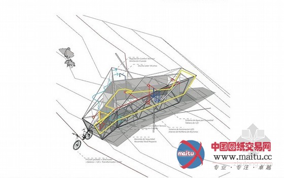 材料是轻量级铝布局和双层极细布。设计时考虑到可延续性,这类小屋可以经由过程自行车踏板耗能供电。在上砥砺平面的便携式出亡所照与踏板的力量。Endless Cycling是Cáceres Céspedes设计的第一个原型,这个移动建筑,可用于自行车操练、比赛或旅游。已在智利中间山谷,Pencahue,进行了测试。小屋有两个可调滑腿以适应不法则地形,使之比帐篷更舒适同时还等闲搭放和裁撤。小屋的布局是钢材料和铝制零件,由双层极细织物包裹,遮挡风雨的同时让阳光进来。脚踏式发电机经由过程led发出人造光,太阳能热水器为骑自行车供给了急需的热水淋浴。包含吃饭、睡觉和存放自行车的空间,这类奇特的建筑是最抱负的自行车欢愉爱好者的必备。