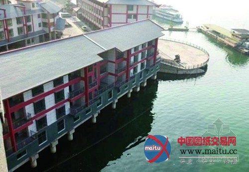 别的一栋楼,连同架空层一路有5层,它的底部已接近水面,模糊可以看到下面也是由几个混凝土柱子撑持。两栋楼之间,有一半圆形的水泥不雅景平台,一样是从江水中打桩撑持起来的。项目标打算红线示意图上,却由打算局明白界定为酒店公寓楼。
