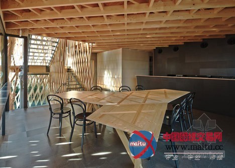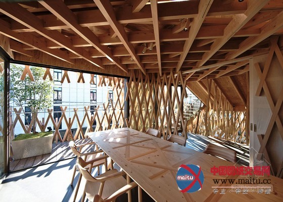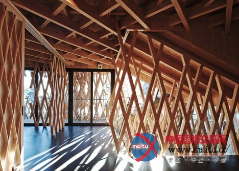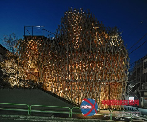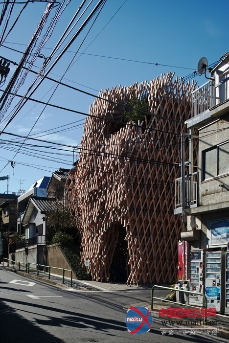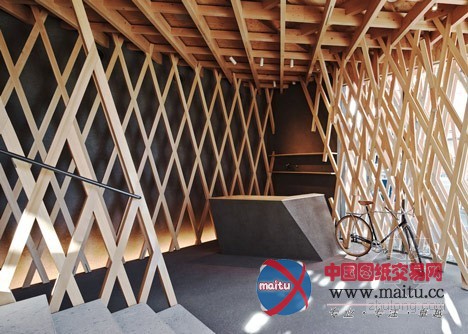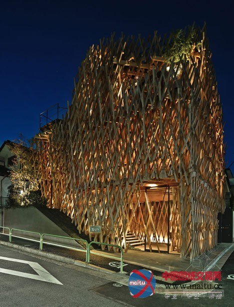 所以建筑师仿照一个精心建造的竹篮子来塑造建筑的外不雅。超越5000米长的木头条被用来机关切确的3D网格,环抱在三层楼的外墙壁和天花板周围。木条长短不一,以便露出多层和削减整体线性。“我们的方针是成立一个在繁忙城市中间的丛林,” Kengo Kuma说。“我们研究了一成天在树林照明状况的改变,并提出了一个外形像篮子的设计。”窄木条以30和60度角摆列,成立数以百计的钻石形凹陷,并被日本本地工匠组装。“我觉得木材关节没有胶水或钉子是日本建筑的本质,”Kuma弥补道。“点阵的角度是SunnyHills的。与传统的90度不合,我们测验测验了30度和60度来连络木条。”“经由过程设计这些不合的角度,我们可以或许实现一个外形和一个框架,来唤起对丛林的想象。”他弥补道。一个角落里的进口带领客人到店,据有建筑物两层。各色各样楼梯踏板大年夜小的不合,楼梯两侧装潢的是抽芽的树叶。一楼地板是软木砖。建筑师还添加了一个厨房。上层是一间会议室和工作人员办公室。