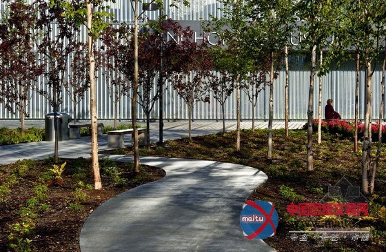 摘要:经由过程桦树编织的收集道路,就来到了博物馆的进口,黑色的混凝土板道路和白色的博物馆外不雅构成对比,构成了一种自由而原始的景色。为了丰硕景不雅,也在其他处莳植了色叶树和地被植物,增加了植物不雅赏的季相性。