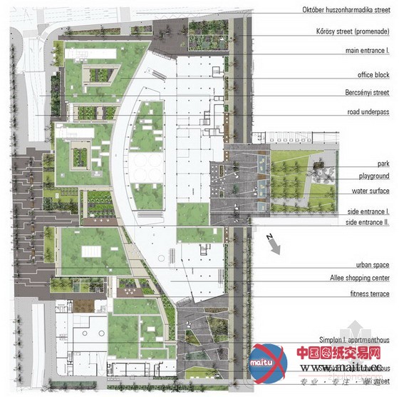 匈牙利的公司和几家外资公司介入了建筑设计(Chapman Taylor, Finta Stúdió, Lukács 和 Vikár, T2A),全部设计也将园林景不雅和园艺设计一并涵盖,使我们有机缘可以看到一个材料一致、调和的开放空间。