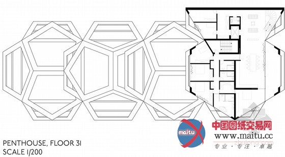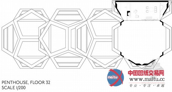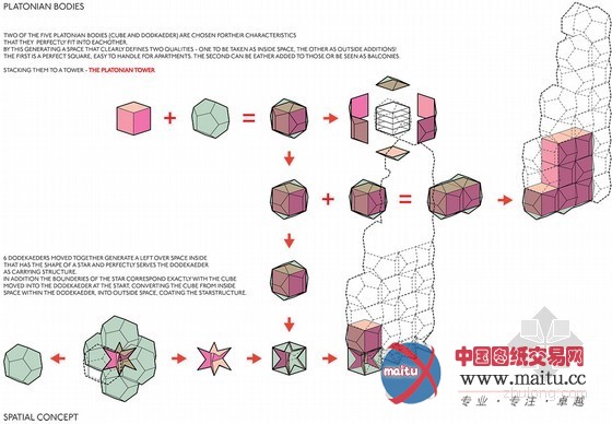 塔的根本由两个柏拉图学派几何图形构成:方形和十二面体。公共广场可以经由过程踏步达到,被封锁在一个露天的矩形区域,作为完美的根本完全嵌合五角多边形构成的个别单位。严格的外部框架的内部情势可以自由放置,包含户外露台。