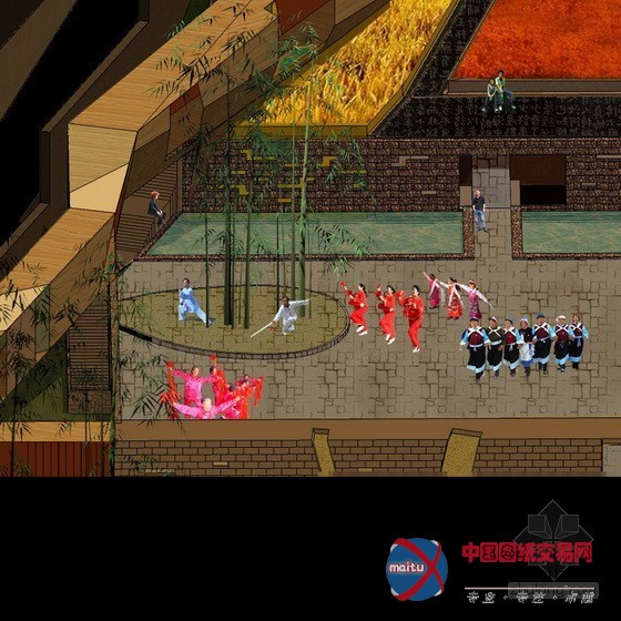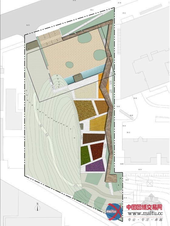 这块空位的边缘外形不法则,并且从北到南的高度相差了近13米,与城市大年夜厦相连的半开放式广场也比街道路面高了3米。基于如许的场地前提,设计师保留了空位的原有地貌,并采取了中国传统的竹林天井设计编制,使这个处所不但合适小孩们玩游戏,也合适白叟下棋、打太极、吹奏表演等。从天井东北角开端,一条露天走廊像虚线一样沿着土墙,蜿蜒地爬过山坡,通往坡顶,最后达到公园的进口。走道和土墙之间构成多处三角区域,这从头界定了公园的东部鸿沟。在这些三角区域中,竹子、花草和树木构成了一幅幅斑斓的中国丹青。行走于此道,真可谓是达到步移景异的艺术结果,让人们在行走间领略中国传统园林的精髓。