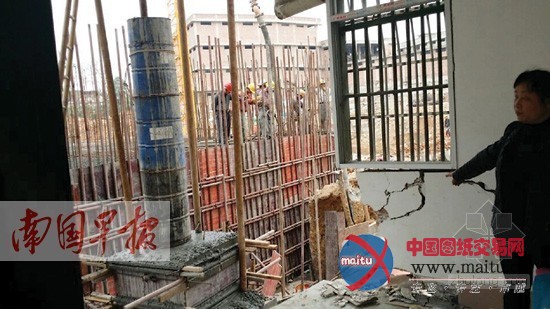 3月25日下午,记者来到中秀路居民家,这是一栋3层半的楼房,共有30多间房屋,位于建筑工地的西面,相距不到1米远。一楼紧靠工地的两间后屋,有一面墙倒塌了一半,还有一面墙已完全倒塌,几根铁杆支撑着二楼的天花板,罗女士称这两堵墙倒塌于3月14日,施工方担心整栋楼坍塌,所以用铁杆支撑住。