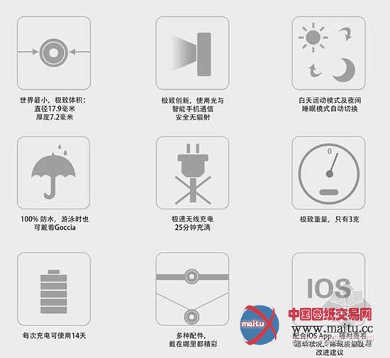 除世界最小的极致体积外,Goccia在功能上还有多项硬功。Goccia立异的利用光同步手艺,没有益用无线电射频,但却能跟所有的手机及平板交互,没有辐射标题问题。Goccia100%防水,你可以带着它泅水;Goccia采取无线充电,25分钟便可布满,每次布满可持续利用14天。Goccia由金属铝和Corning?Gorilla?玻璃精心打造而成,包管您悠长利用。Goccia主动辨认睡眠模式可以或许在活动和睡眠间主动进行切换,省往手动切换的懊末路。