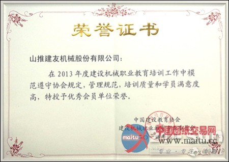 中国扶植教育协会扶植机械职业教育专业委员会2013年度工作总结表扬暨2014年度培训工作研究会于3月27日在郑州召开,山推建友公司被授予“优良会员单位”称号。