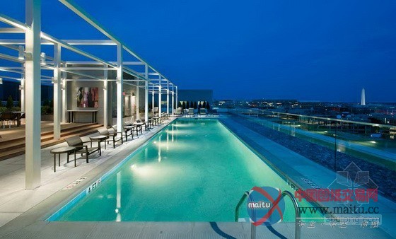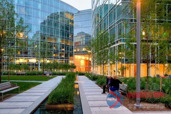 泊车楼上方中间天井的水景,表示了华盛顿汗青性的城市网格与宾夕法尼亚大年夜道轴线的交叉。该水景是大年夜雨洪治理系统的一部门,汇集基地中所有的雨水。接下来雨水经由过程雨洪过滤装配,排进位于天井下五层泊车库中容量7500加仑的蓄水池。这些水被不竭地轮回,经由过程水生植物水景进行措置,供给弥补性过滤。汇集的水还将在全部发展季候顶用于天井植被的浇灌。开辟区的屋顶包含8000平方英尺宽阔广大奔放的绿色屋顶,构成微气候,降落本地的热岛效应,供给鸟类栖息地,为建筑隔热并最大年夜限度地削减屋顶径流。多余的雨水在汇集到下面的水景和蓄水池之前,经由过程绿色屋顶层过滤。城市综合污水管道系统其实不完美,国度林荫大年夜道和低处地区经常被沉没,造成区域河道和小溪的污染,而基地本身的可延续水系统则大年夜大年夜地降落了对城市污水管道系统的依托。
