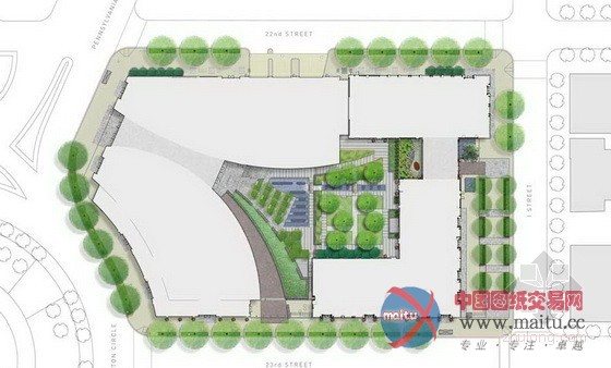 54广场四座建筑的底面设计旨在促进综合区中开放空间的公共功能。周围的街景包含宽阔的人行步道,道路边缘是一排排遮荫乔木,大年夜型的莳植槽布满了同化的常绿植物、矮灌木和开花乔木,一系列建筑莳植槽中是花团锦簇的季候性植栽。所有的泊车区都位于地下,在开辟区下面有五层泊车库。