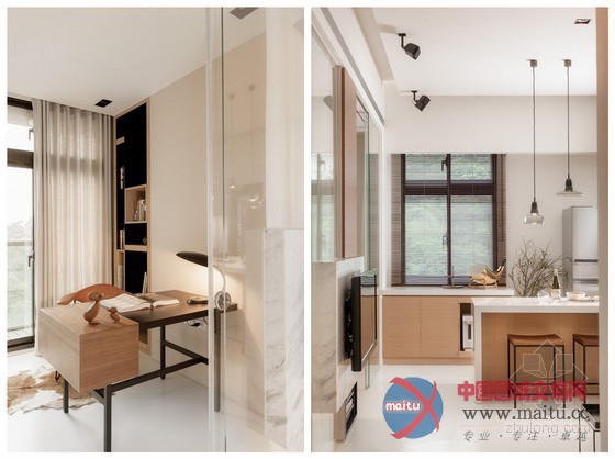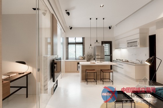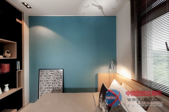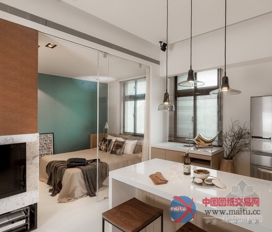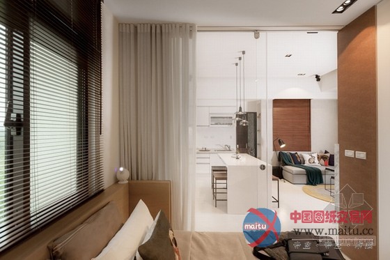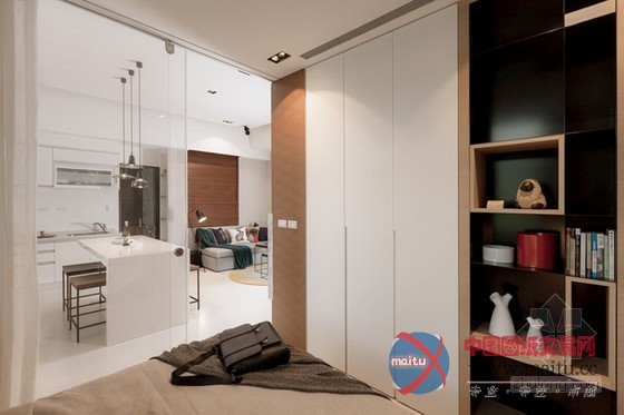 这是台湾小户型家居装修室内设计,设计师将隔断距离全数打通,在刚正的空间中从头打算。一半是糊口区,一半是公共区域,卧室与书房、厨房与客堂的面积根基均等,看上往对称、顺眼。为了不华侈多余的卧室空间,在中间设置了一个衣柜,另外一半用作书房,比墙体矫捷良多,又可做丰硕的装潢。玻璃拉门隔断距离很是洁净,在小户型中有效的放大年夜面积,进步空间亮度。软装的安插虽少却到位,凸起了现代简约气焰,几个抱枕与卧室的复古绿色墙壁还很有些英伦风采。