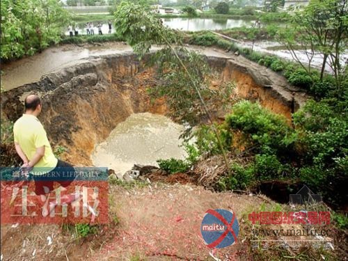 记者在采访中,不时看到塌陷的深坑边上有土块往下滑落,深坑侧面还呈现了一个裂痕,隔壁鱼塘的水正从裂痕中流进塌陷的深坑,裂痕有扩大年夜的趋势。有村平易近奉告记者,本来塌陷的鱼塘并没有这么大年夜,它是一点点扩大年夜的,每隔一阵就有土方塌陷。“快看,又塌了!”正跟记者措辞的一名村平易近惊叫起来,鱼塘边上一堵巨大年夜的泥方轰然倒下。