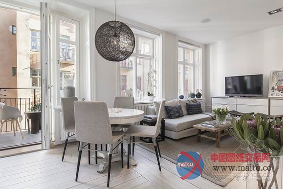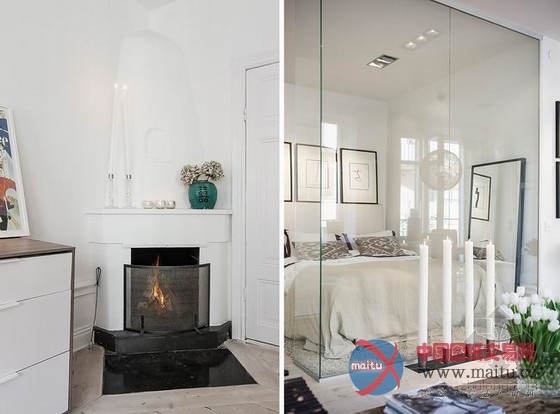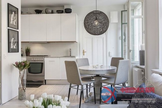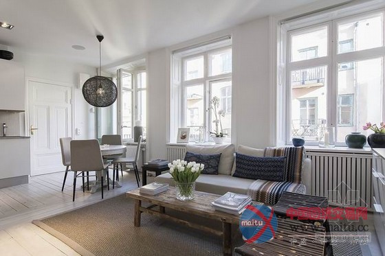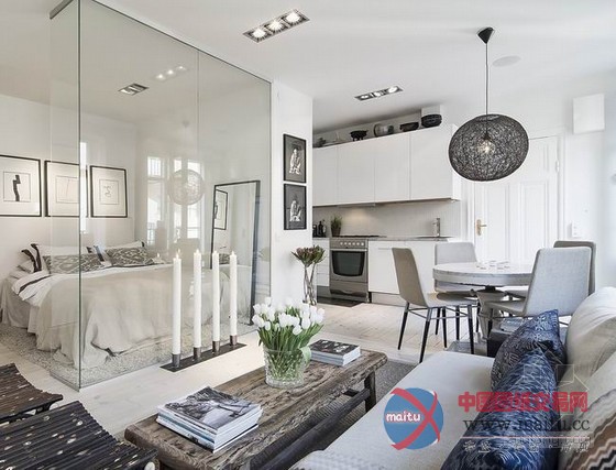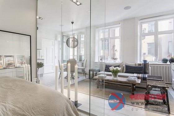 这座公寓设计,格局刚正,开放式的空间,进门左手边是厨房,右手边则是卫生间,餐桌和客堂并没有边界往豆割,而与卧室之间也仅仅是一堵透明的玻璃,三扇大年夜窗户使屋内的每个角落都可以获得阳光的晖映,柔和的色调,几件复古家具,鲜花,配饰,烛台,小空间下却涓滴没有影响到主人的格调。