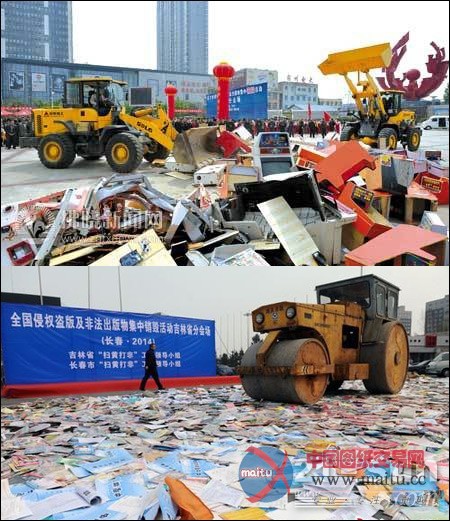 24日在太原,侵权盗版等非法出版物共计12.2万册(盘)被集中销毁;24日在长春,65万张(册)侵权盗版及非法出版物被集中销毁;24日在北京,30万件盗版和非法出版物被集中销毁,等等。一时间,全国各地几乎同时掀起了轰轰烈烈的侵权盗版等非法出版物集中销毁活动。中国工程机械商贸网编辑注意到,在此过程中,工程机械产品充当了绝对主力,挖掘机、装载机、压路机等争相上阵,大显身手。
