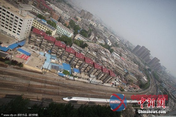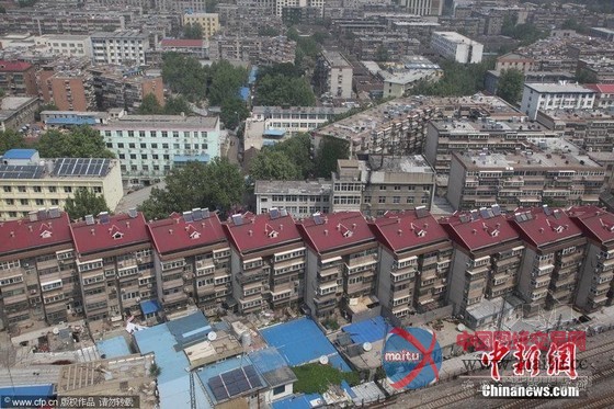 2014年04月26日,山东省济南市,济南居民楼酷似奇葩“连体楼” ,在省城天桥东侧,9栋居民楼紧挨在一起看起来酷似“连体楼”,像楼梯一样呈有序折叠形状,吸引众多路人的眼球。