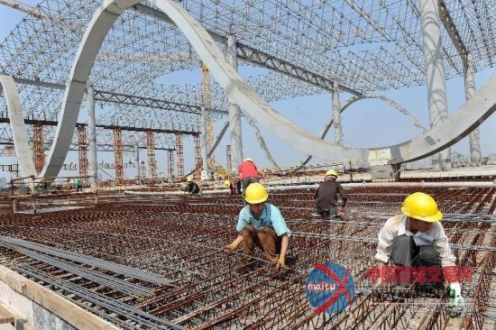 建设者在屋顶钢筋绑扎施工。