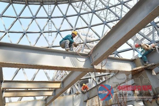 建设者在屋顶球型建筑焊接施工。