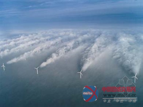 这张航拍照片显示的是丹麦海域的“号角礁”(HornRev)远岸海上风力发电站,距离陆地15公里。一期工程建成于2002年,由80个发电机组成,装机容量160MW,叶轮直径80米、中轴高70米、相邻中轴距离560米。由于天气和海浪不稳定,维护人员的主要交通工具是直升机。